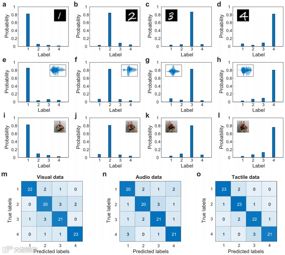 研究人员使用了三种不同模态的数据集来验证TDONN芯片的多模态推理能力。图4a-d、e-h、i-l分别显示了视觉、听觉和触觉三种模态的分类概率分布。实验结果表明,通过光域在线训练,TDONN芯片具有实现光域多模态分类任务的能力。为了进一步验证TDONN芯片的推理能力,每种模态分别使用100个测试数据对该芯片进行了测试。图4m-o展示了三种模态的测试数据的混淆矩阵,分类准确率分别可以达到86%、82%和89%,平均准确率为85.7%。
