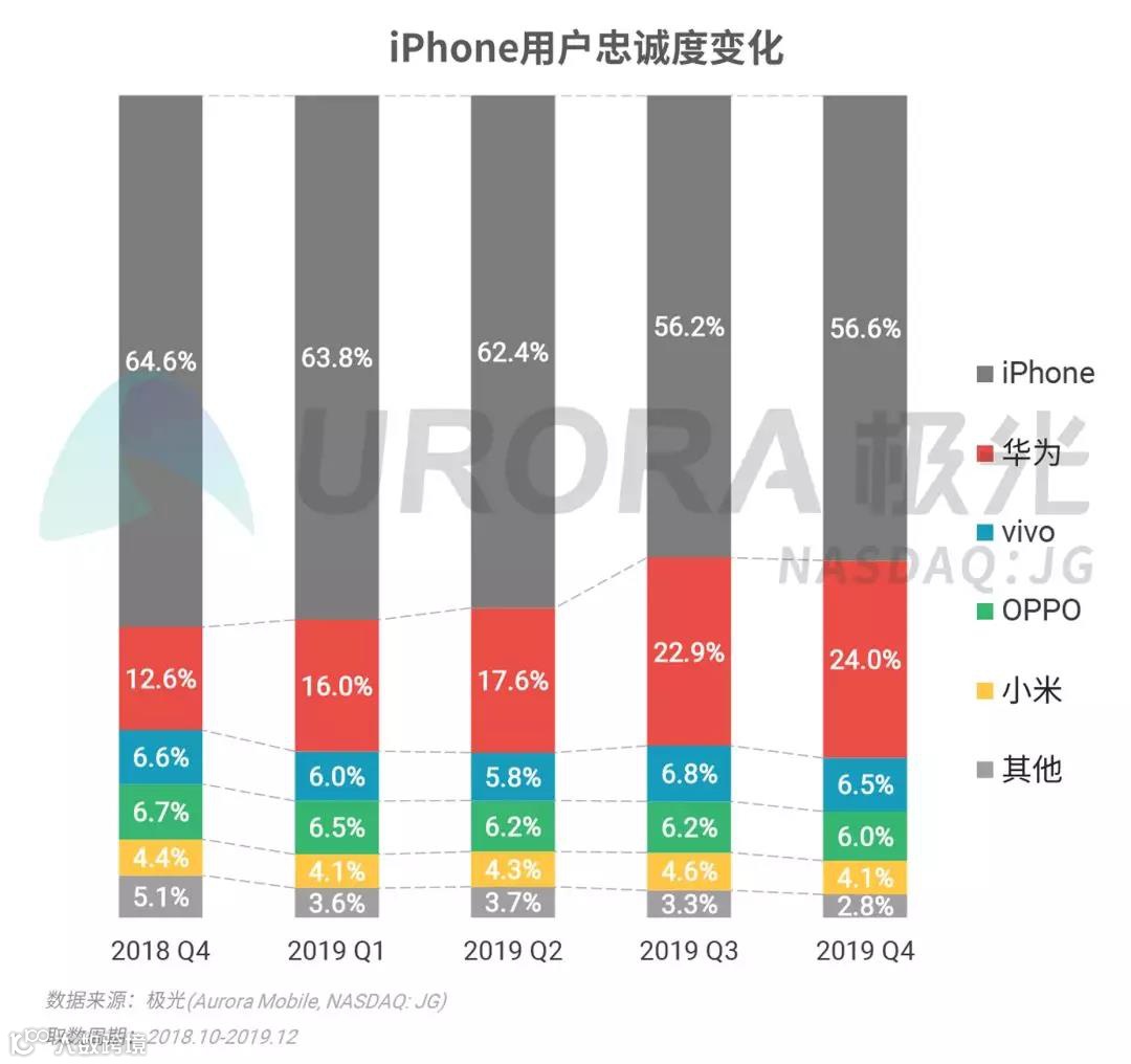 极光大数据显示,2019年第四季度iPhone用户忠诚度为56.6%,基本与上一季度持平,结束连续3个季度下滑的趋势;iPhone用户换机选择华为手机的比例进一步提升,占比达24%。