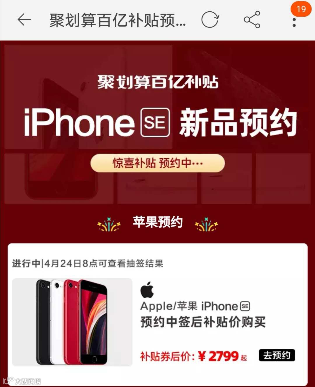 此外,聚划算百亿补贴已上线新iPhone SE,预约中签后补贴价购买售价为2799元起,较原价减500元。