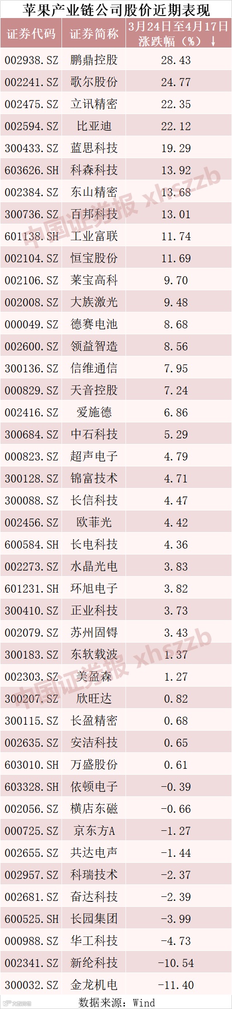 近期苹果产业链公司股价有所回暖。Wind数据显示,3月23日,苹果产业链42只股票集体大跌,当天跌幅超5%的达33只。此后,又走出反弹行情。自3月24日至4月17日,涨幅超过10%的股票达10只。