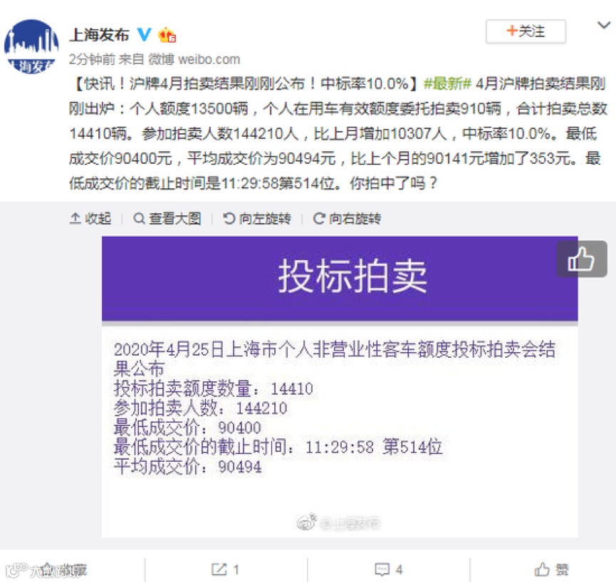 今日,上海发布官方微博消息称,4月沪牌拍卖结果也已出炉,其中,个人额度13500辆,个人在用车有效额度委托拍卖910辆,合计拍卖总数14410辆。参加拍卖人数144210人,比上月增加10307人,中标率为10.0%:最低成交价90400元,平均成交价为90494元,比上个月的90141元增加了353元。最低成交价的截止时间是11:29:58第514位。