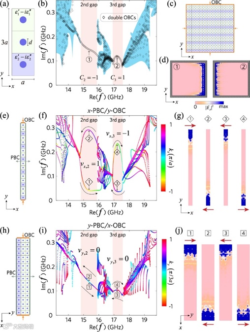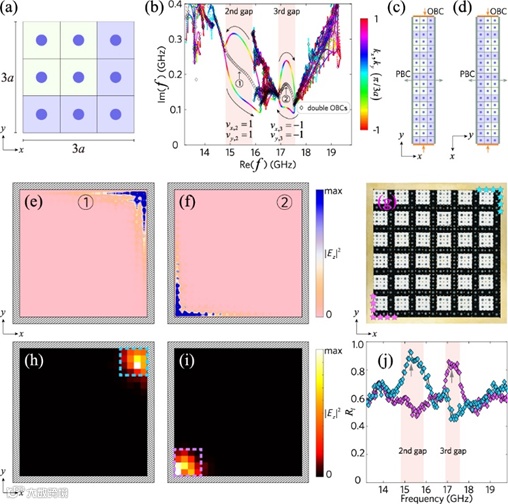 进一步地,作者又构建了一个光子晶体单元如图4(a)所示,它在x方向和y方向的镜面对称性均被打破,因此无论对于x-PBC/y-OBC还是y-PBC/x-OBC情形均具有非平庸的点带隙和缠绕数(图4(b-d))。进一步地,x方向和y方向同时存在的非厄米趋肤效应使得手性边界态局域在零维角落上,如图4(e-f)所示。图4(g-j)中的实验结果验证了这种猜想。
