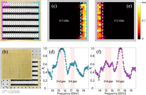 实验所加工的样品如图3(a-b)所示。为了激发这种局域化的手性边缘态,作者分别在左边界和右边界附近放置了一系列点源,并分别扫描每个点源激发的场分布,然后将所有点源激发的场分布的强度进行叠加。当点源位于右边界且激发频率位于第二个带隙(15.3 GHz)时,得到的场分布如图3(c)所示,显示边界态局域在右边界。为了展示这种局域化具有频率选择性,研究人员还绘制了局域在右边界的能量(图3(c)中的青色方框)在整个样品中的能量比例,如图3(d)所示。结果表明,仅在第二个带隙的频率范围内,边界态在右边界具有明显的局域性。类似地,当点源置于左边界时,仅在第三个带隙范围内观察到明显的左边界局域性,如图3(e-f)所示。