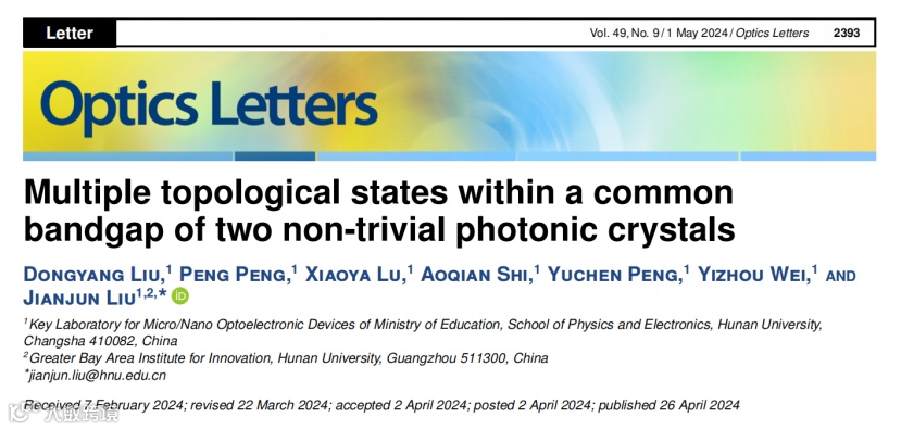 D. Liu, P. Peng, X. Lu, A. Shi, Y. Peng, Y. Wei, and J. Liu, “Multiple topological states within a common bandgap of two non-trivial photonic crystals,”Optics Letters, 49(9): 2393–2396 (2024).