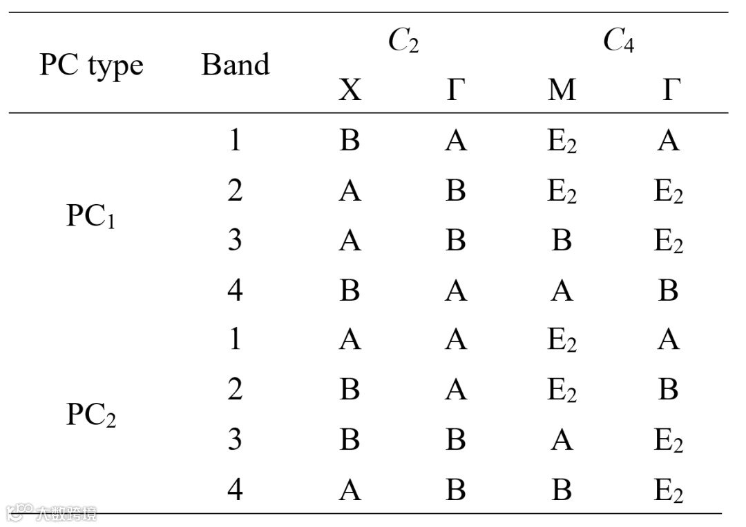 表1两种Penrose-square光子晶体高对称点处本征模在C2及C4对称性下的不可约表示。