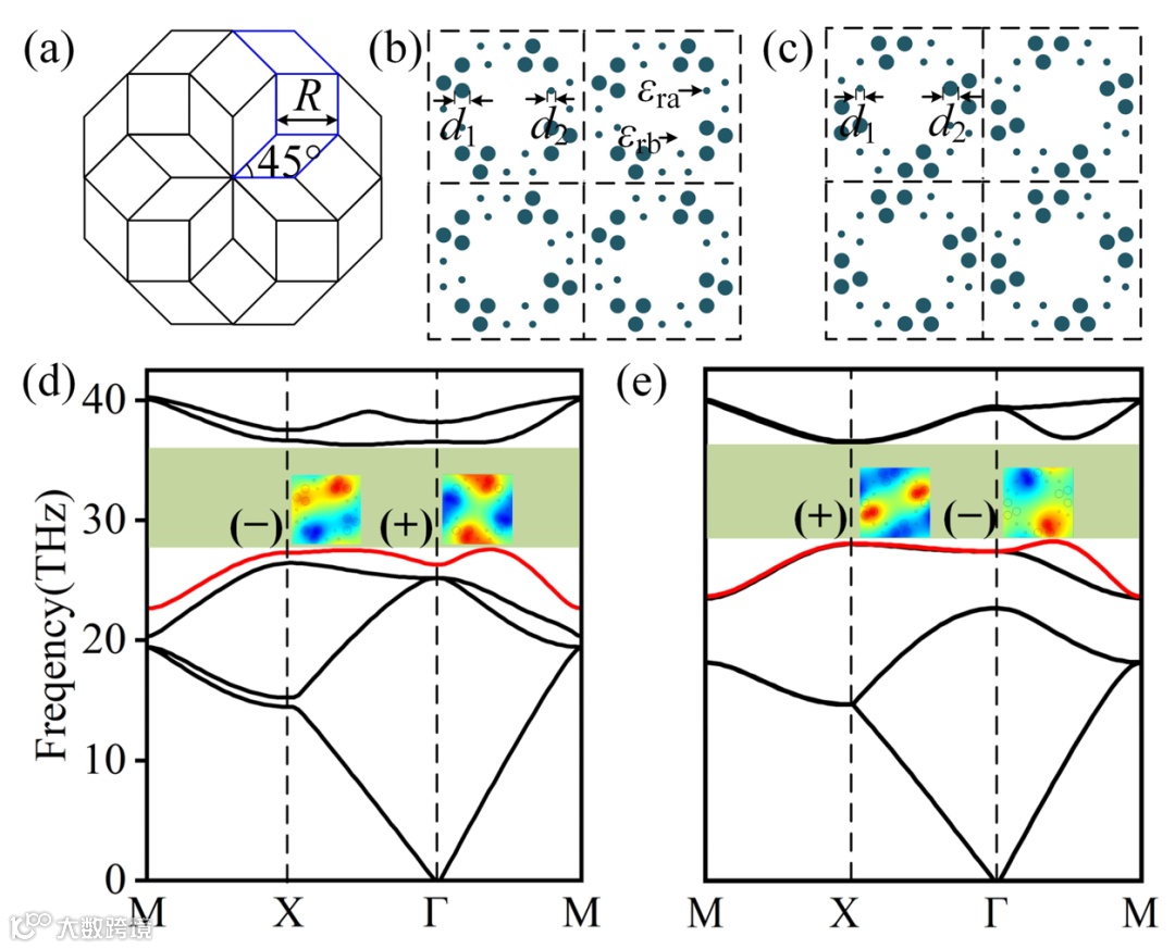 图1 (a) 八重Penrose型光子准晶的基本结构单元晶格;在Penrose型光子准晶的部分格点处布置圆柱形散射子并以正方晶格周期阵列形成Penrose-square光子晶体(图中仅给出了2×2个基本结构单元):(b) PC1,d1 > d2;(c) PC2,d1 < d2。散射子为锗(其相对介电常数为εra = 16),周围背景为空气(εrb = 1);两种散射子的直径分别为d1、d2。能带结构:(d) PC1;(e) PC2,通过电场分布可以确定宇称,其中“+”表示偶宇称,“−”表示奇宇称。