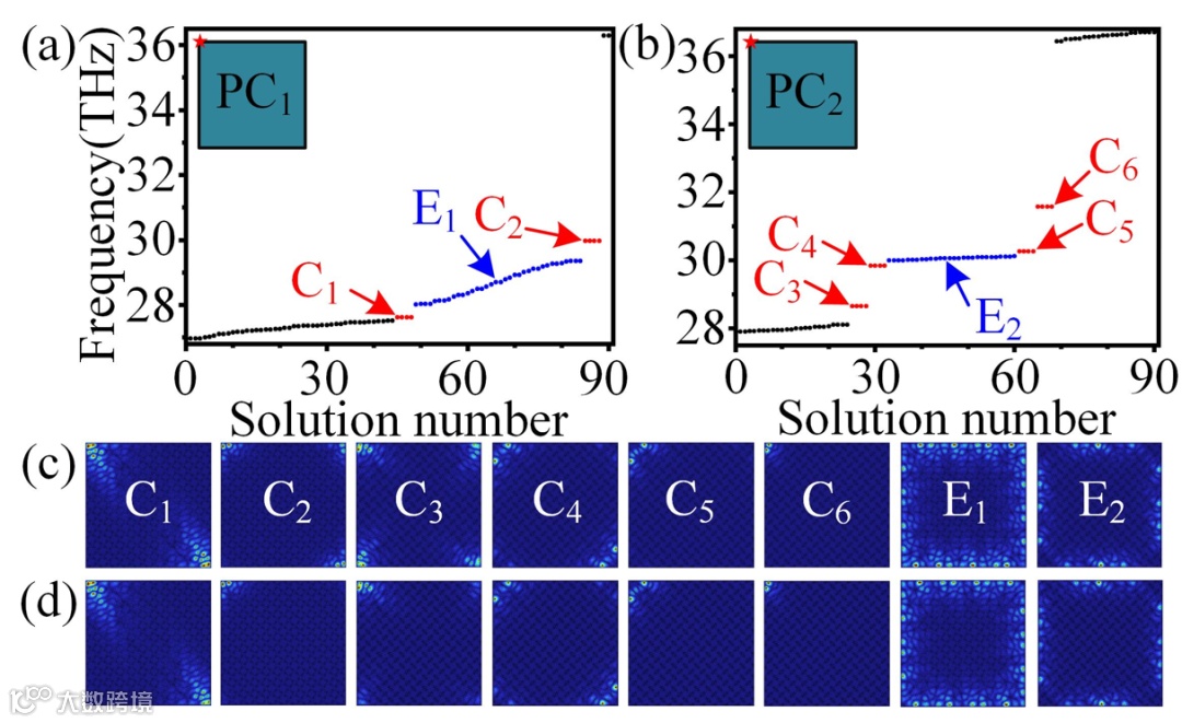 图2 完美电导体(黑色边界)环绕Penrose-square光子晶体11×11个基本结构单元时的本征频谱:(a) PC1;(b) PC2,红点表示拓扑角态,蓝点表示拓扑边界态,黑点表示体态。(c) 点C1−C6及E1−E2处的本征模。(d) 不同频率下由光源激发的电场分布,光源位于结构的左上角(图(a)和(b)中的红星)。