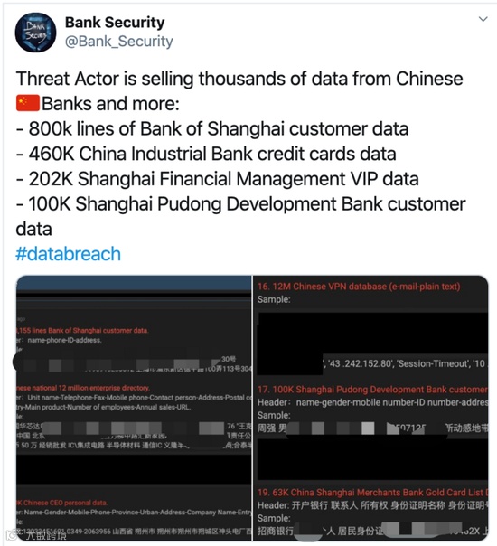 社交媒体账号Bank Security近日发布消息称,有数百万国内银行客户的数据正在被出售,涉及兴业银行、上海银行、浦发银行等,相关信息超过百万条。