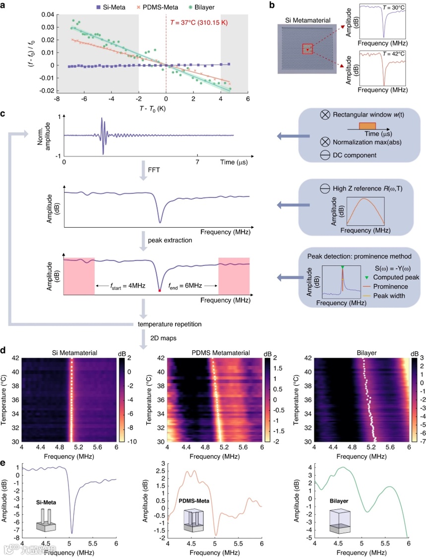 a)从4英寸、500μm厚开始的硅晶片制造工艺流程,基于深度反应离子蚀刻(DRIE)和聚二甲基硅氧烷(PDMS)涂层作为聚合物基体;b)制造的硅微柱的扫描电子显微镜(SEM)细节,包括测量尺寸及晶胞单元的示意性俯视图;c)展望了声温传感器的应用和传感原理。利用超声波探头来探询位于植入物表面上的传感器。温度变化会改变相关材料(PDMS和Si)的体积模量,从而导致声学模式的谐振频率与温度变化成正比。