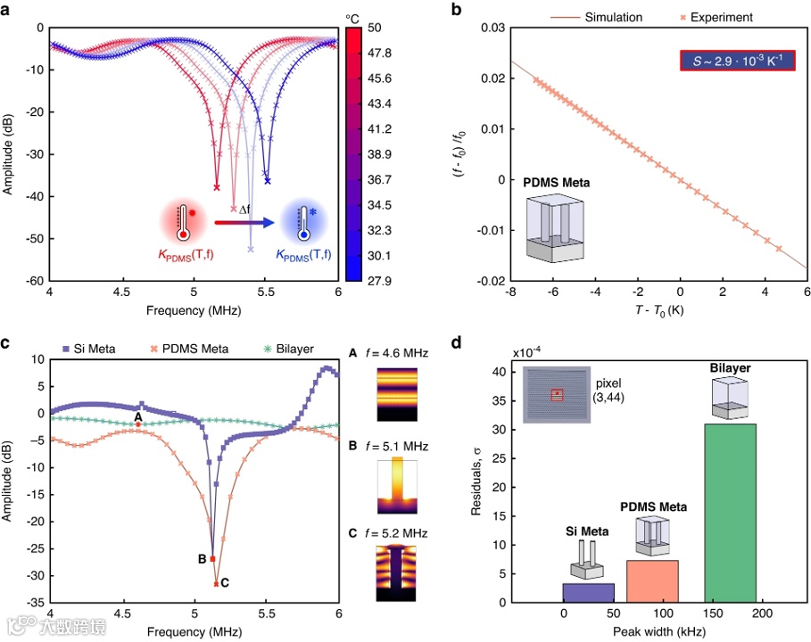 a)PDMS-Meta的模拟反射频谱,体积模量KPDMS的变化相当于温度变化;b)模拟(交叉标记)和实验(连续线)温度灵敏度的比较;c)三个传感器的模拟反射频谱和50 °C(~323 K)时的声学模式形状;d)像素(3,44)的残差与三个传感器的峰值宽度温度上的平均值的实验标准偏差(\({\rm{\sigma})},计算值为−0.5 dB。