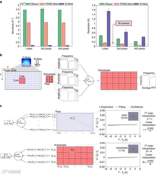 a)每像素的平均温度灵敏度和分辨率。虚线:用于医学测温的红外(IR)相机的典型分辨率(见结果:实验设计)。b)ROI定义为9×90像素(浅蓝色矩形)。子样本(粉红色正方形)包含3个 × 3像素;c)在单像素分析\((\bar{r},\bar{s})\)和子样本分析\(\ bar{r},\par{s}))中提取灵敏度和分辨率以及标准偏差的过程。