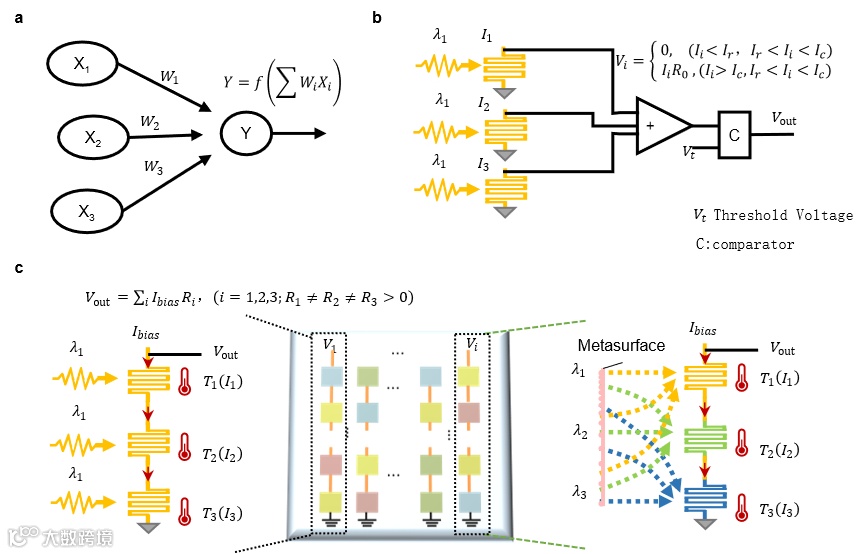 图3 、(a)人工神经网络原理图;(b)基于本文器件的硬件人工神经网络原理之一;(c)两端口的硬件人工神经网络原理。