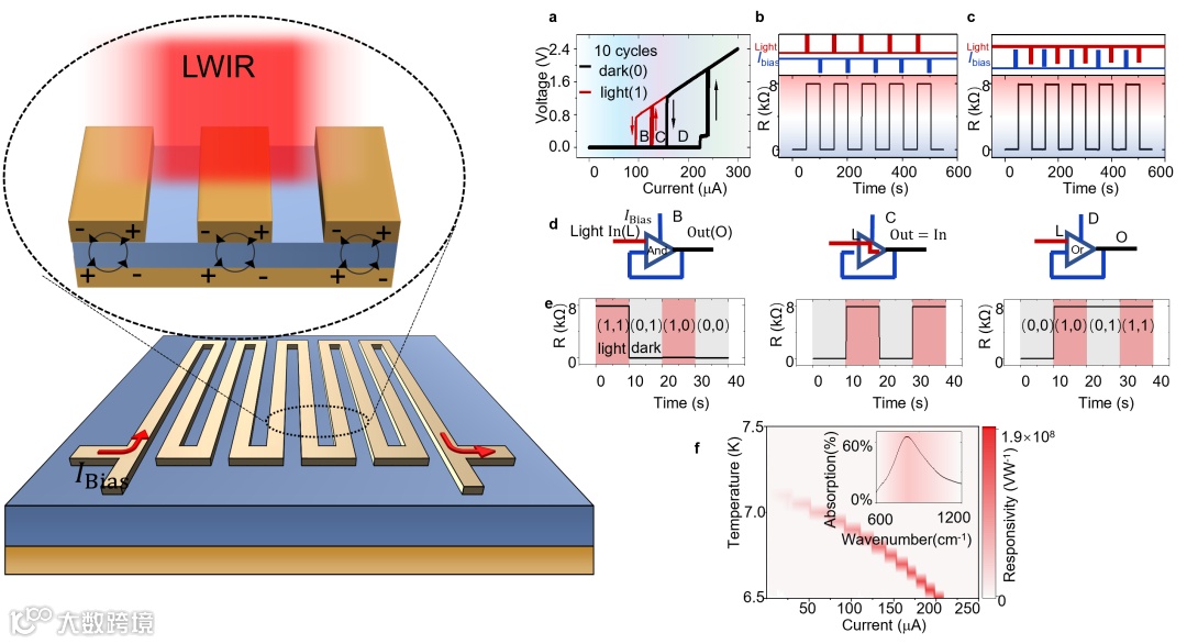 图1 、左图为器件结构示意图:(a)照光与非照光下的双稳态IV曲线;(b)(c)光/电写入与擦除和保存数据操作;(d)(e)不同电偏置下可重构逻辑电路原理图与实验数据;(f)12.2微米工作波段下的响应率。
