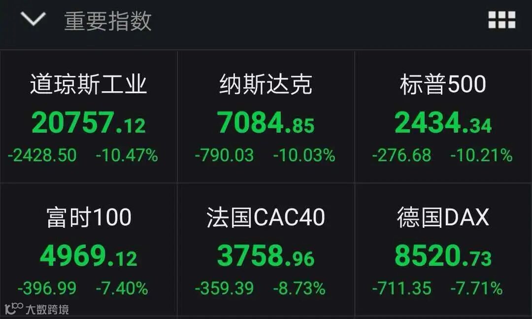 截至发稿时,美股三大指数跌幅均在10%左右。
