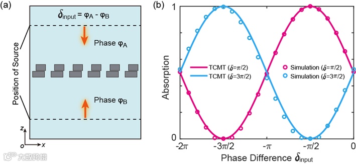 图4 相位差连续可调的相干完美吸收。(a)相干吸收示意图,(b)不同辐射相位差情况下,相干吸收随入射光相位差的变化。