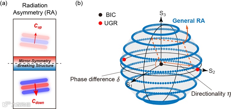研究团队提出了一般非对称辐射的赝偏振物理图像,将任意非对称辐射一一映射到赝偏振的几何参量(图2(a))。结合庞加莱球,研究团队发现连续域束缚态(BIC)和单向导模共振(UGR)分别对应于球心和S2轴的极点,而一般非对称辐射光学行为则可以由庞加莱球球面完整描述(图2(b))。