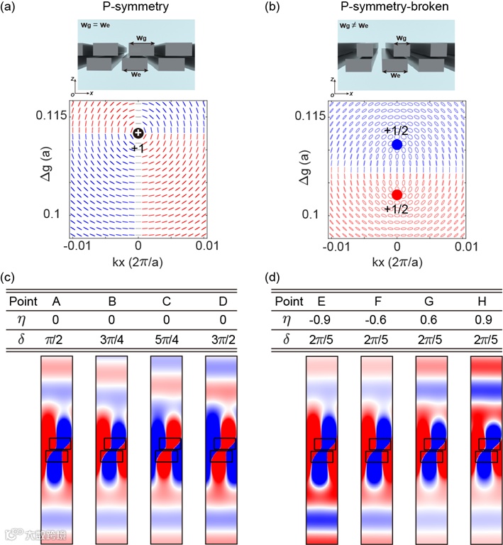 图3 单向度和相位差的独立调控。(a,b)打破空间反演对称性前后的赝偏振场分布,(c)单向度恒定,相位差连续可调,(d)相位差恒定,单向度连续可调。