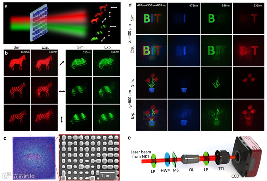 图3 (a)(b)所设计和加工的偏振加密超表面全息样品1和(c)(d)彩色超表面全息样品2 (e)为实验光路图