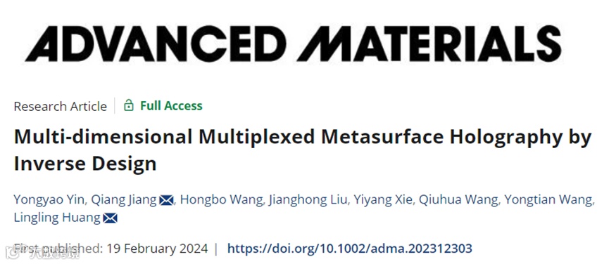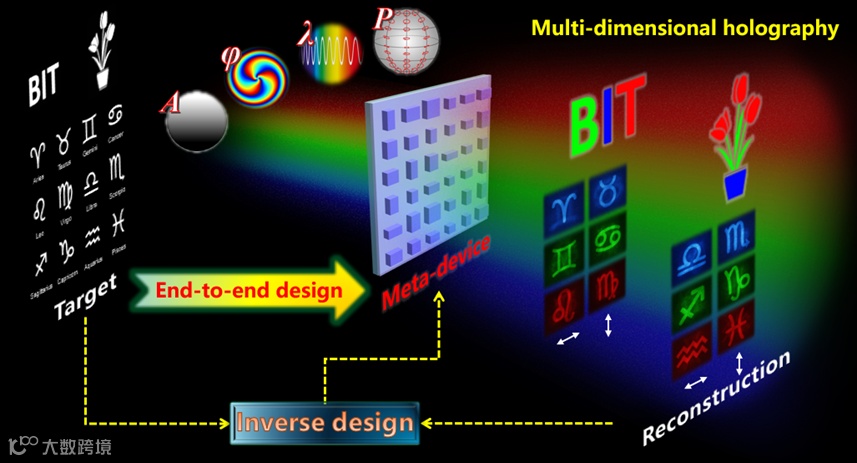 近日,北京理工大学光电学院黄玲玲教授团队采用端到端的逆设计方法实现了多维度多通道超表面全息设计。通过将物理设计问题转换为数学优化问题,构建损失函数和超表面结构参数之间的直接关联关系,基于优化算法,实现了从目标图像输入到超表面参数输出的端对端设计,简化了设计流程,提升了多通道全息图像的重建质量。相关成果以“Multi-dimensional Multiplexed Metasurface Holography by Inverse Design”为题发表于Advanced Materials期刊。北京理工大学光电学院蒋强副研究员和黄玲玲教授为论文通讯作者,硕士研究生尹永耀为论文第一作者。