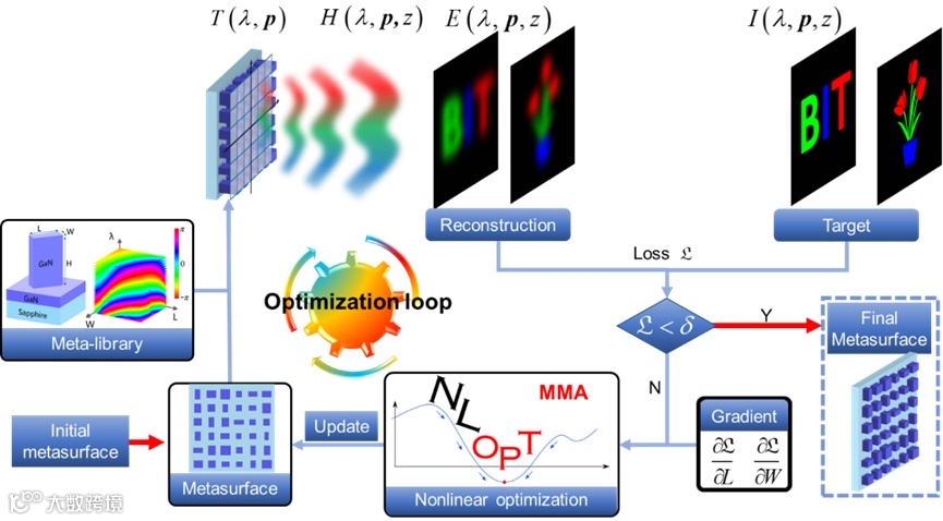 在该工作中,为了打破正向设计的限制并简化设计流程,团队提出了一种端到端的逆向设计框架,如图1所示。通过将超表面直接与多个目标全息重建图相关联,并根据重建图像质量指导优化过程,实现超表面的尺寸参数的更新,基于低自由度超原子实现了多维度超表面的端对端设计。