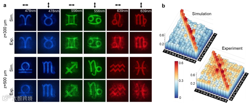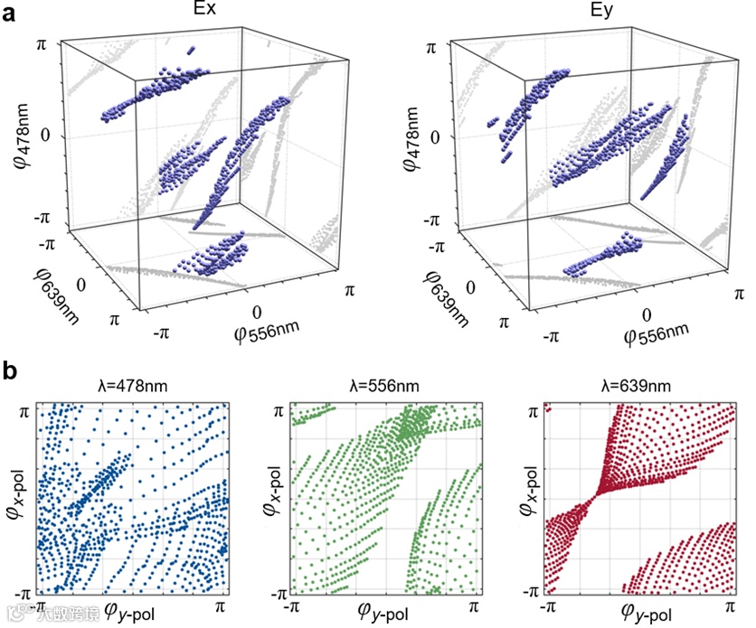 值得注意的是,本研究中使用仅具有两个自由度的超原子即可实现高达12通道的低串扰全息显示。研究人员对所使用超单元库的完备性进行了分析,图5a和b分别展示了超单元库的相位响应在三波长空间和线偏振空间的映射分布。可以明显看出所使用的单元库是不完备的,无法实现多个波长和偏振态解耦。这种不完备单元库在正向设计中产生的误差是难以消除的。但在逆设计中,由于超表面单元分布直接对全息重建图像质量负责,没有中间过程的限制,可以很好地统筹每个通道的图像重建效果,实现更高的重建质量。端到端的设计思路显著降低对超原子库完备性的要求。