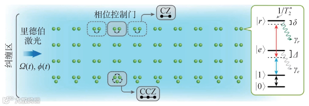 图2 利用里德伯阻塞并行地进行多对原子间的两比特或三比特量子门操作,使得一次经典操控可以同时驱动大量的量子门和量子操作[9]。CZ代表两比特相位控制门,CCZ代表三比特相位控制门。右侧能级图展示了如何通过一束蓝光(420 nm)和一束红外光(1013 nm)将原子能级|1⟩态激发到里德伯态|r⟩