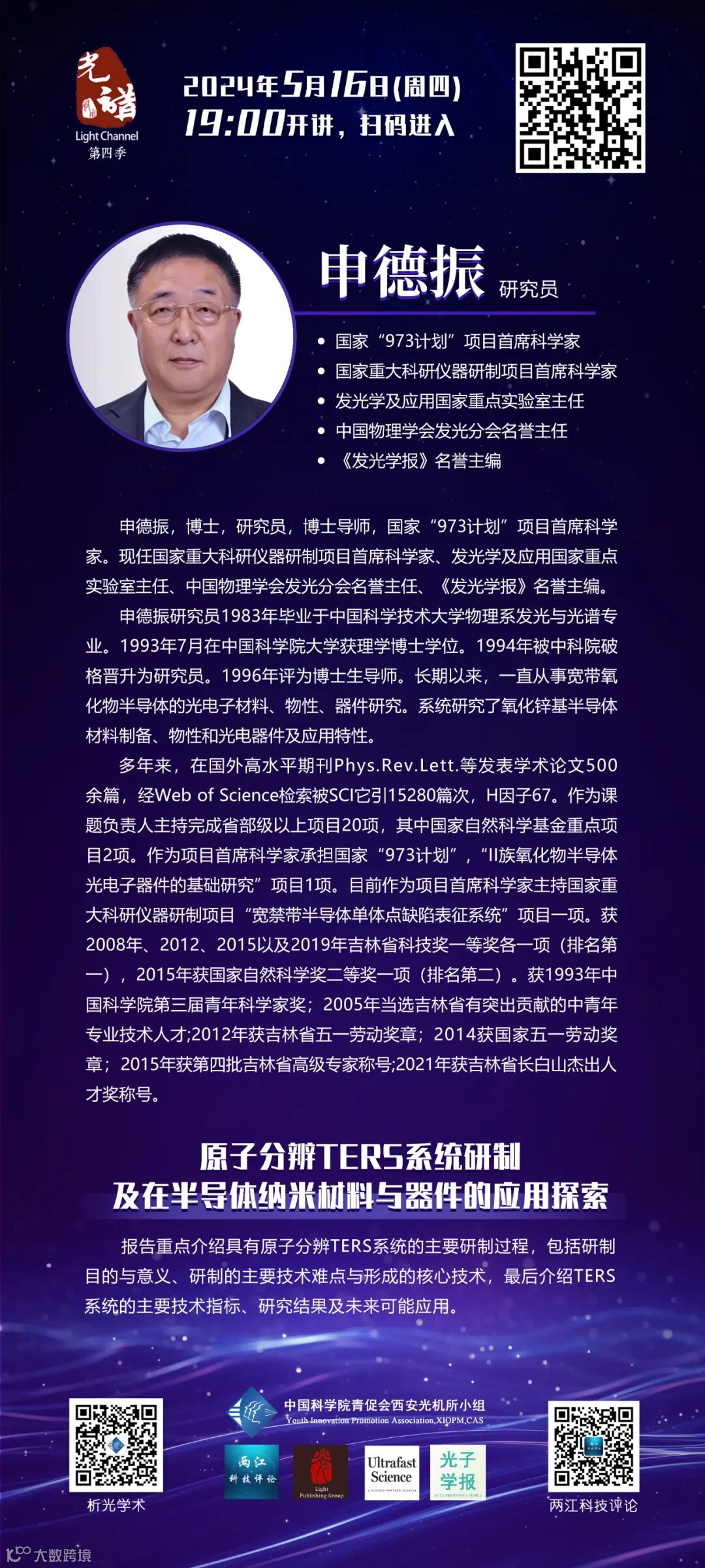 申德振,博士,研究员,博士导师,国家“973计划”项目首席科学家。现任国家重大科研仪器研制项目首席科学家、发光学及应用国家重点实验室主任、中国物理学会发光分会名誉主任、《发光学报》名誉主编。