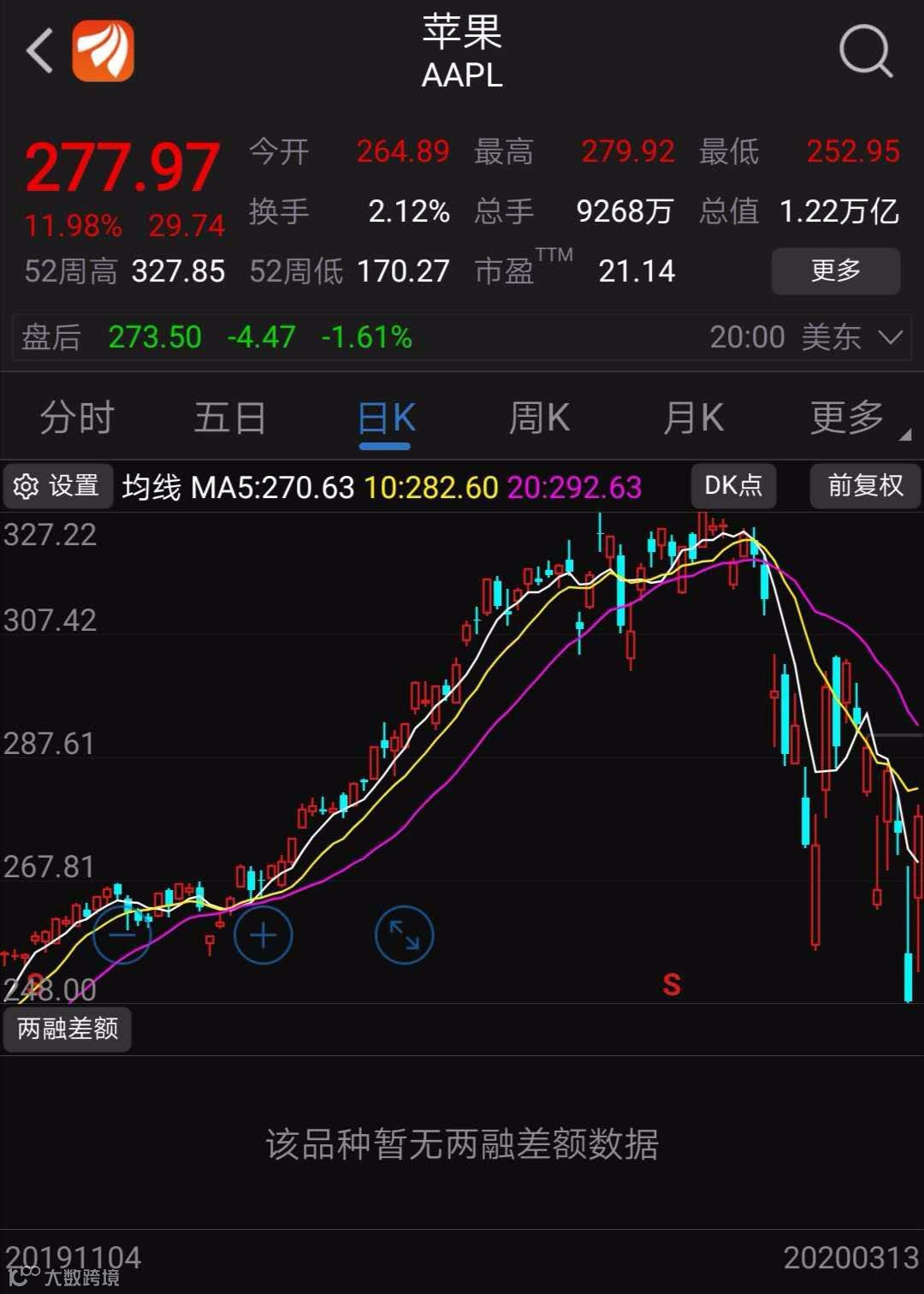 受疫情海外蔓延影响,全球多地股市震荡。近期美股暴涨暴跌,苹果股价表现不佳。