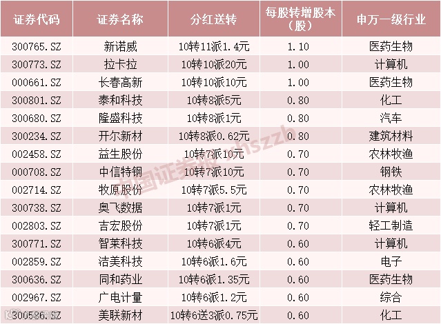 长春高新、拉卡拉拟10股转增10股,此外,泰和科技、隆盛科技、开尔新材拟10股转增8股,美联新材则拟每10股送红股3股,同时转增6股。