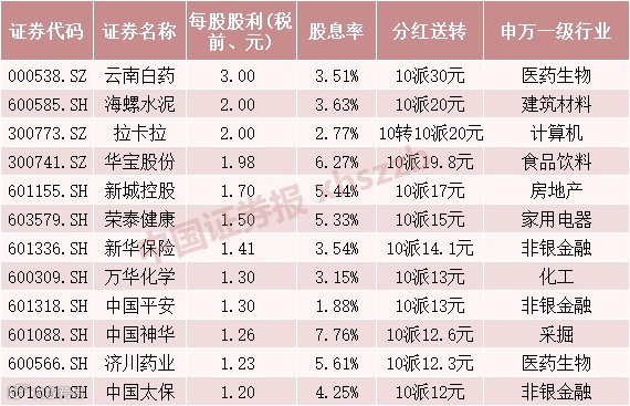 数据显示,截至3月31日下午,两市已有550家上市公司发布2019年利润分配方案,其中28家公司每股股利(税前)超1元,云南白药目前每股股利最高,达到3元。