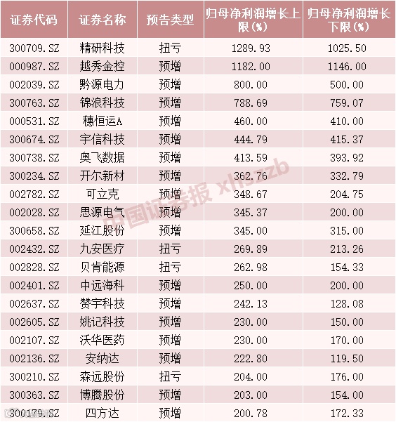 精研科技、越秀金控预告今年一季报归母净利润最大增幅超10倍,分别为1289.93%、1182%。