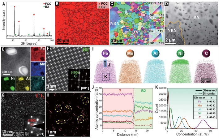 了这一原理的范式转变,揭示了脆性、非共格和不可剪切的B2金属间化合物可以通过LCO和大量固溶强化来增强邻近的奥氏体基体,从而使其具有延展性。这种模式是通过改变B2颗粒周围的变形机制,从Orowan环和位错堆积到颗粒剪切来实现的。