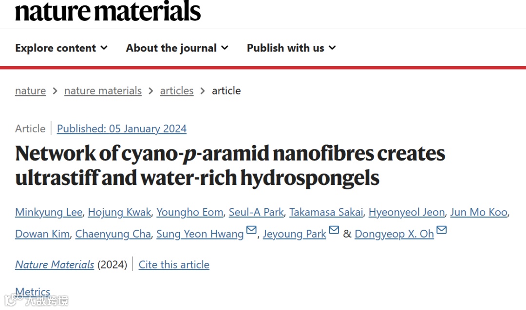 近日,韩国化学技术研究院Dongyeop X. Oh、Jeyoung Park和Sung Yeon Hwang合作报道制作了水凝胶/海绵杂化材料(水海绵凝胶),它们既是超刚性富水凝胶,又是可逆挤压海绵。由氰基对位芳纶纳米纤维组成的自组织网络所容纳的水大约是其固体含量的 5000 倍。即使水的浓度超过 90%,水海绵也像软骨一样坚硬,弹性模量为 50-80 兆帕,比典型的水凝胶硬 10-1000 倍。通过孔弹性松弛和 120 °C 水热压,它们可承受 85% 以上的压缩应变。这种性能得益于纳米纤维的两亲表面、高刚性和纤维间相互作用驱动的渗流网络。这些特性可为未来生物功能材料的开发提供灵感。相关成果以“Network of cyano-p-aramid nanofibres creates ultrastiff and water-rich hydrospongels”为题发表在 Nature Materials上。
