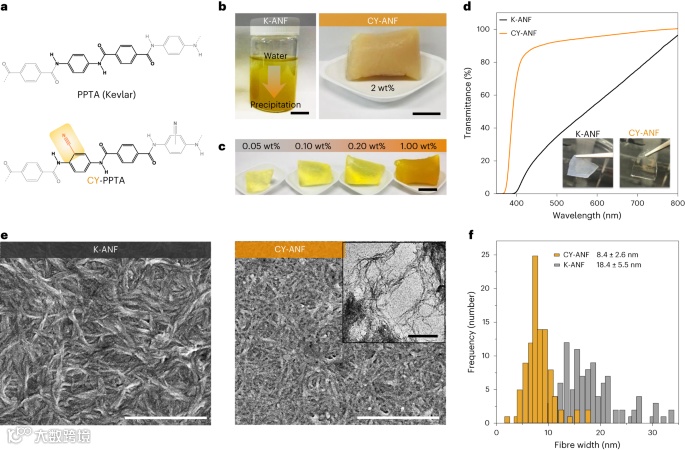 CY-ANF 水海绵的制备始于聚(2-氰基对苯二甲酰胺)(CY-PPTA)的合成。图 2a 比较了传统聚对苯二甲酰胺(PPTA;Kevlar)和 CY-PPTA 的化学结构。与传统的 Kevlar ANF(K-ANF)相比,CY-ANF 正交位置上的 CY 基团会影响水凝胶结构的自组装能力。CY-ANF 溶液形成了独立的水凝胶,其尺寸不会因收缩或膨胀而发生显著变化(图 2b),这表明存在很强的纤维间相互作用。即使 CY-ANF 含量很低(0.05 wt%;图 2c),也能形成不含粘合剂的聚合物自支撑网络。CY-ANF 水海绵比 K-ANF 凝胶更透明(图 2d)。透明度越高,表明纤维间剥离程度越高,断面越不聚集。根据其冻干表面的扫描电子显微镜(SEM)和透射电子显微镜(TEM)图像,CY-ANF 纤维比 K-ANF 纤维细得多(图 2e),平均纤维直径分别为 8.4 ± 2.6 nm 和 18.4 ± 5.5 nm(图 2f)。由于侧基阻止了纤维间的堆叠,因此可以确定氰基取代能更均匀地分散单个纳米纤维。