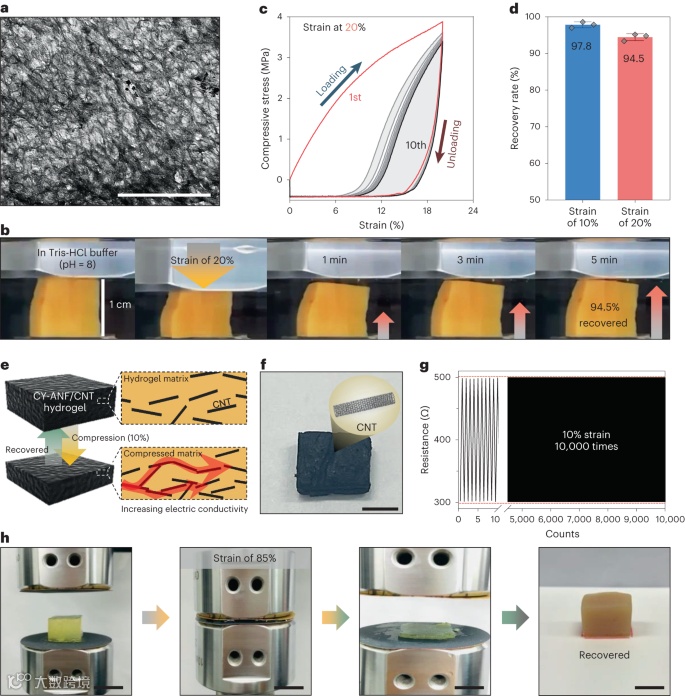 在这项研究中,使用CY-ANFs制备了水凝胶。即使在CY-ANF含量低至0.05 wt%的情况下,CY-ANF优异的自组装能力也能构建出独立的水凝胶。此外,所形成的网络由高度多孔的骨架结构组成。这种多孔网络表现出非凡的承载能力,即使在超富水条件下也具有无与伦比的压缩和拉伸模量。