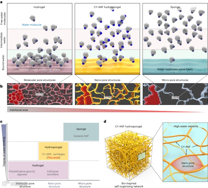 水凝胶和海绵是一种合成的湿材料,由于其高含水量(>70%)和容纳生理物质的能力,使人想起生物组织。因此,这两种类型的湿材料都被广泛研究为组织工程支架和药物递送载体的有前途的候选者。生物组织模拟物在可穿戴电子和软机器人应用中的使用最近有所增加,这也导致了对湿材料的需求增加。但是,水凝胶和海绵受到合成材料的限制,而生物组织具有两种湿材料的选择性优势。软骨承受重负荷,含有大量的水,并且由于其多孔结构而表现出生理物质的扩散性。然而,合成水凝胶和海绵是不相容的。低含水量的水凝胶相对较硬,因为与聚合物链强结合的水分子限制了孔隙弹性变形,从而限制了传质。相比之下,海绵的多孔连续相骨架有助于长程压缩,这允许水自由流动,从而导致高质量扩散率。尽管水凝胶在其屈服点以上会发生不可逆变形,但海绵是可重复压缩的。然而,海绵太软,太容易排出含水量。