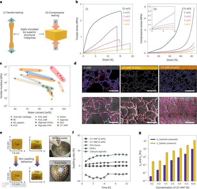 为了评估低应变模式,固体含量在1-10范围内的CY-ANF水凝胶的机械强度和模量 通过拉伸和压缩试验测定wt%(图4a、b)。Ashby图显示了CY-ANF水凝胶和先前报道的水凝胶的拉伸或压缩模量作为含水量的函数。CY-ANF水凝胶显示出无与伦比的性能,在含水量超过90%时观察到合适的拉伸和压缩模量。通常,由于溶质含量不足,典型的水凝胶在高含水量(>90%)下表现出较差的机械性能。然而,1 wt%的CY-ANF水溶性凝胶(含水量为99 wt%)表现出0.71和0.61的压缩强度和模量 MPa,抗拉强度和模量分别为0.28和2.3 MPa。这些值与含水量约为75的关节软骨和合成聚乙二醇水凝胶的值相当 wt%。最近,Kotov等人报道了具有4.0和9.7的压缩模量和拉伸模量的富含硬水的K-ANF/PVA水凝胶 在含水量为70时分别为MPa wt%。