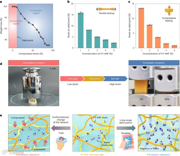 在这项研究中,合成了一种水溶性凝胶,它在低应变下起到超坚固的富水水凝胶的作用,在高应变下起着快速排水的可重复压缩海绵的作用(图1)。Cyano-p-ANFs(CY-ANFs)是水凝胶与海绵杂化的关键。CY-ANF网络表现出5400 wt%的非凡保水能力和22.5倍的高比模量(5.2 ± 2.8 兆帕 wt%-1)比先前报道的基于ANF的水凝胶。CY-ANF网络可以被压缩高达85%。这种具有快速水迁移的长程变形可归因于孔隙弹性松弛27。由于稀疏固体浓度下的构象链排列不适应长程变形28,大多数水凝胶在如此高的应变下断裂,水分释放可忽略不计。