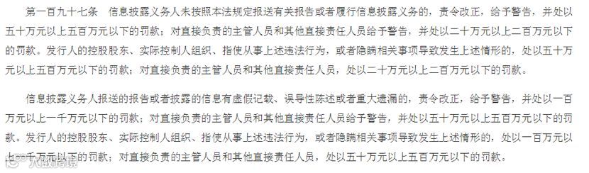 中伦律师事务所指出,原《证券法》第一百九十三条虽然划分了“披露”行为和“报送”行为,却未在行政责任上进行区分。新《证券法》第一百九十七条修改了原《证券法》的上述处罚逻辑,以“未按照本法规定报送有关报告或者履行信息披露义务”和“报送的报告或者披露的信息有虚假记载、误导性陈述或者重大遗漏”为尺度,对两种情形规定了差异化的行政责任,并对后者苛以更重的行为后果,足见新《证券法》的处罚逻辑更加合理。