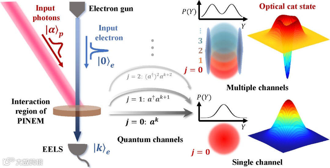 基于对PINEM系统中自由电子与超快光场相互作用的深入研究,刘运全课题组和何琼毅课题组合作提出了一种实现光学猫态制备与调控的理论新方案。利用自由电子与光子之间的强耦合相互作用,自由电子可以等效地吸收或放出多个光子,从而形成多条不同的量子通道。在弱耦合时,光场中的光子数远远大于电子等效吸收或放出的光子数,单条量子通道对光场量子态的影响几乎可忽略。在强耦合条件下,由于多条量子通道之间存在量子干涉,使得输出光场的量子态受到调制,从而可以实现光学薛定谔猫态的制备,如图1所示。