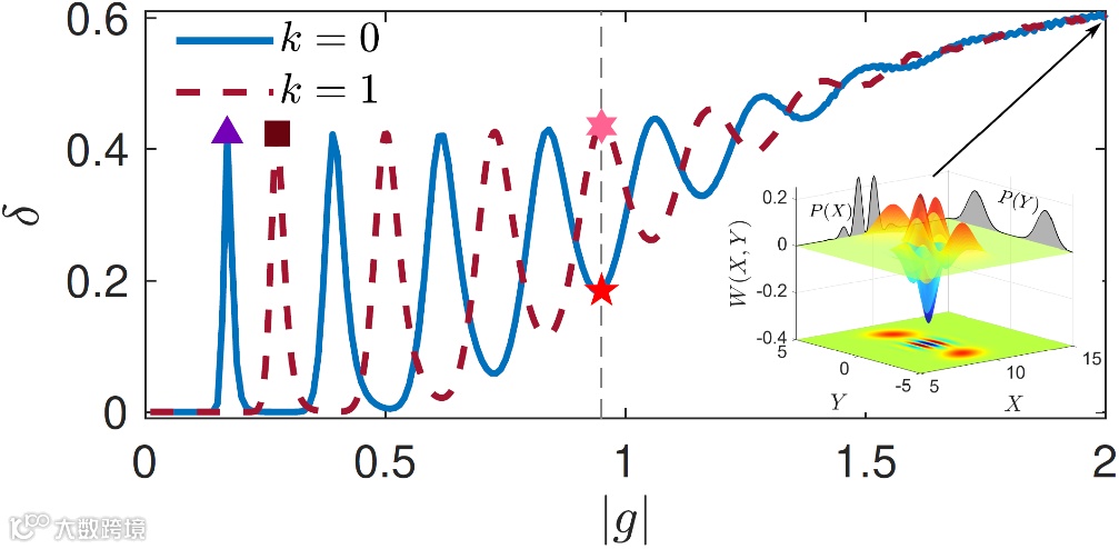 通过改变自由电子与光子间的耦合强度,研究团队发现可以利用输出光场量子态的Wigner负性,刻画自由电子与超快光场相互作用中的干涉效应。如图2所示,输出光场量子态的Wigner负性随耦合强度的增加而发生振荡,出现类干涉条纹的现象。由于Wigner负性反映的是输出光场的非经典性质,这意味着利用量子通道之间的相干相长,可极大地增强输出光场的非经典性质。研究发现,当Wigner负性达到振荡峰值的时候,输出光场将坍缩为薛定谔猫态,其保真度可达到0.99以上,由此可实现高保真大光子数的猫态制备。