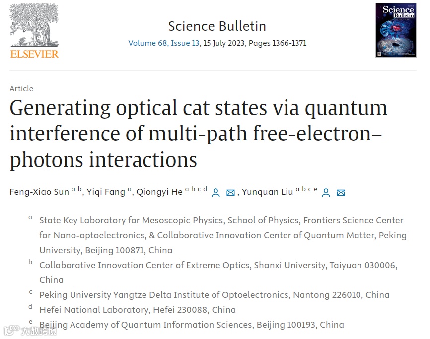 北京大学物理学院现代光学研究所、人工微结构和介观物理国家重点实验室、纳光电子前沿科学中心“极端光学创新研究团队”刘运全教授、何琼毅教授等人,基于自由电子与超快光场的相互作用,提出了制备与调控光学猫态的新方案。相关研究成果以“基于自由电子-光子多通道相互作用的量子干涉效应制备光学猫态”为题发表在Science Bulletin上。