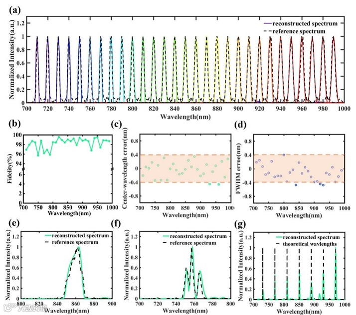 研究团队还测试了系统的光谱曲线恢复能力,结果如图5所示。针对准单色光,重构光谱曲线平均保真度达到98.26%,且中心波长准确性达到0.05 nm,半高全宽准确性达到0.13 nm。针对形状复杂的宽带光谱,也实现了准确重构。