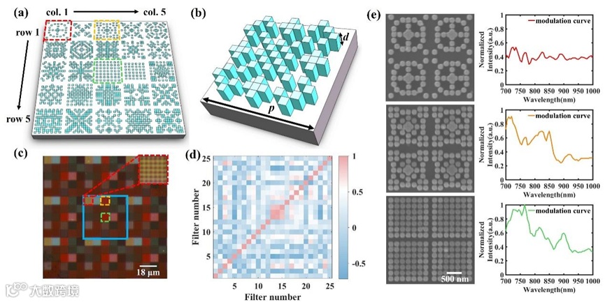 图2超表面结构单元的设计与表征测试。(a)25种结构单元;(b)图(a)中第5行、第3列结构单元斜视图;(c)超表面样品的光学显微镜测试结构;(d)结构单元透射光谱的相关系数矩阵;(e)3种结构单元的SEM测试图及透射光谱标定曲线。