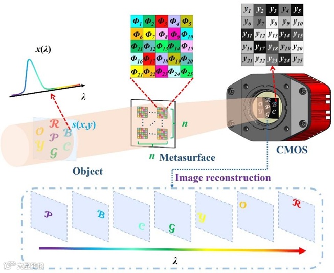 光谱信息作为不同物质的光学指纹,能够在多种场景下用于物质的鉴定与识别,在遥感探测、智慧农业、生物监测、化学分析等多个领域取得了广泛的应用。然而,现有的光谱成像系统多采用窄带滤光片或者棱镜、光栅等色散元件实现不同波长信息的提取。采用窄带滤光片,已发展出分焦面(DoFP)和分时(DoT)探测两种方式。采用DoFP方式时,光谱图像的空间分辨率与光谱分辨率互相限制;而对于DoT方式,光谱成像的时间分辨率受限,难以适用于高速运动场景的准确获取。对于编码孔径快照式光谱成像(CASSI)系统,相对庞大的体积限制了其与移动设备的集成。