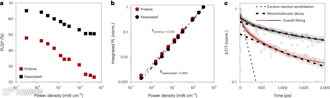 钙钛矿量子点中的线性偏振发光来源于电子能带中的激子精细结构裂分。首先,研究人员通过在不同激发激光强度下测得的静态荧光光谱确认了发光强度与激发强度的线性关系,证明了超薄纳米片中的发光主体为激子发光。并使用碘化铅前驱体溶液钝化纳米片表面缺陷,超快瞬态吸收光谱和荧光光谱证明钝化后的纳米片中,其缺陷复合和激子-激子湮灭的非辐射性复合过程减少,从而提高了发光效率(如图3所示)。