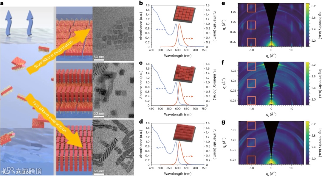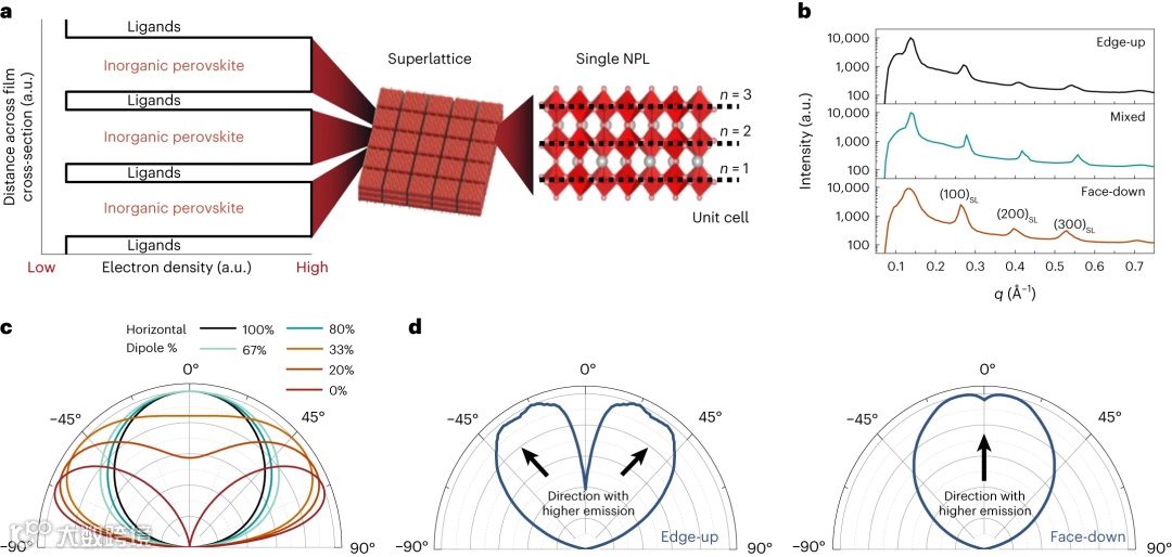 首先,研究人员通过优化合成温度和前驱体比例,制备了高度尺寸均一的纳米片,其在纵向厚度只有大约2.5纳米。通过调控溶剂的种类和蒸发速度,实现了纳米片在薄膜上的有取向性的超晶格排列,包括躺立排列和站立排列(如图1所示)。