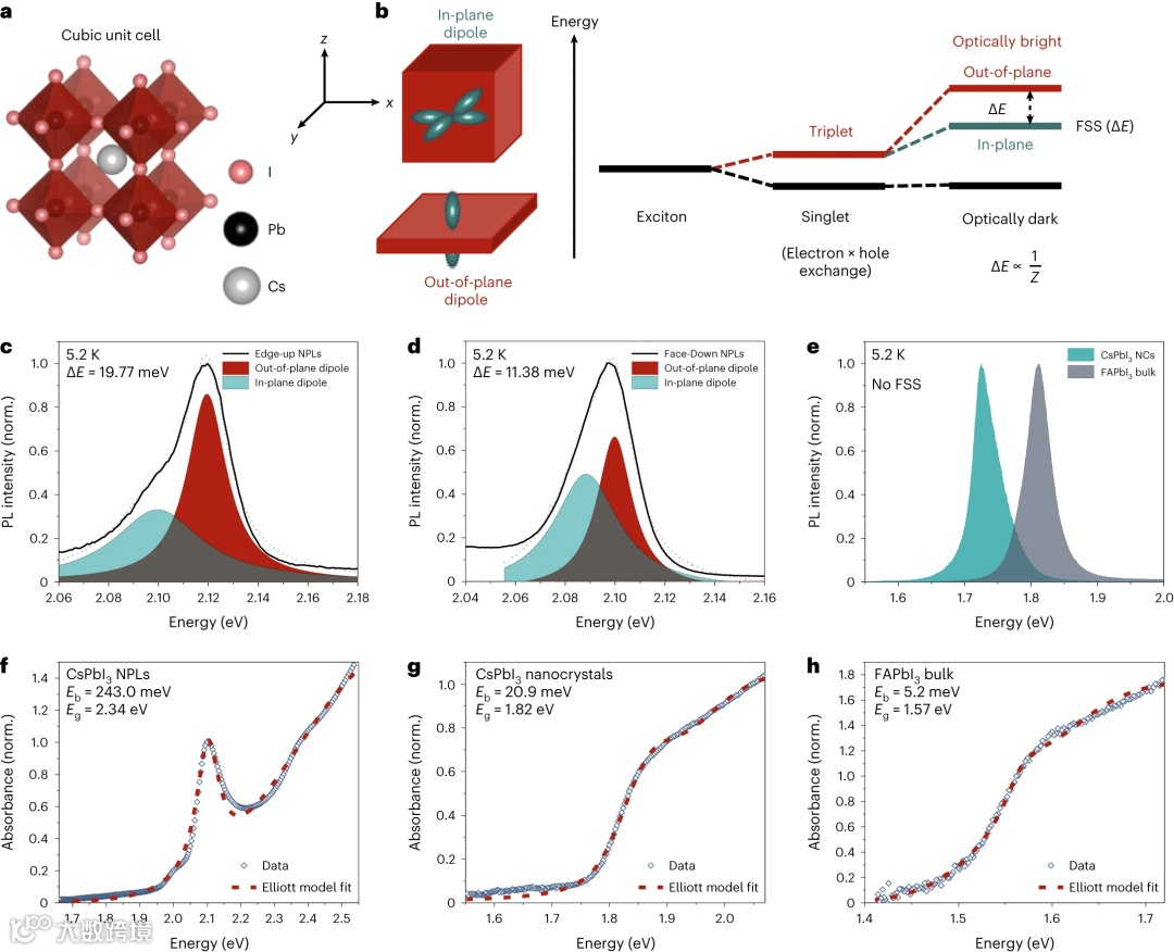 为了探索纳米片体系中高偏振发光的由来,研究人员通过低温荧光测量了激子精细裂分能量。研究人员发现纳米片拥有比弱限域纳米晶和体相薄膜更高的激子精细裂分,其中站立排列的纳米片薄膜在5.2K的温度下,能观测到的裂分能量差大约是19.2 meV,远高于文献汇报过的纳米晶的~1 meV。这与纳米片拥有因强量子限域和介电约束效应产生的更大的激子结合能有关,纳米片的激子结合能大约是243 meV,而弱限域纳米晶和体相薄膜中仅为大约20 meV和5 meV.(如图5所示)。