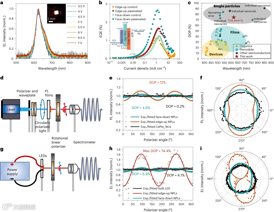 钝化后的材料提升了器件效率,同时因为偶极子的排列问题,站立排列的纳米片薄膜和器件拥有比躺立纳米片更高的偏振发光。与之对比的弱限域纳米晶(CsPbI3)和体相薄膜(FAPbI3) 发光则没有明显的线性偏振性。其中站立排列的器件最大偏振度能达到70%以上,接近了单量子点的发光偏振度(如图4所示)。