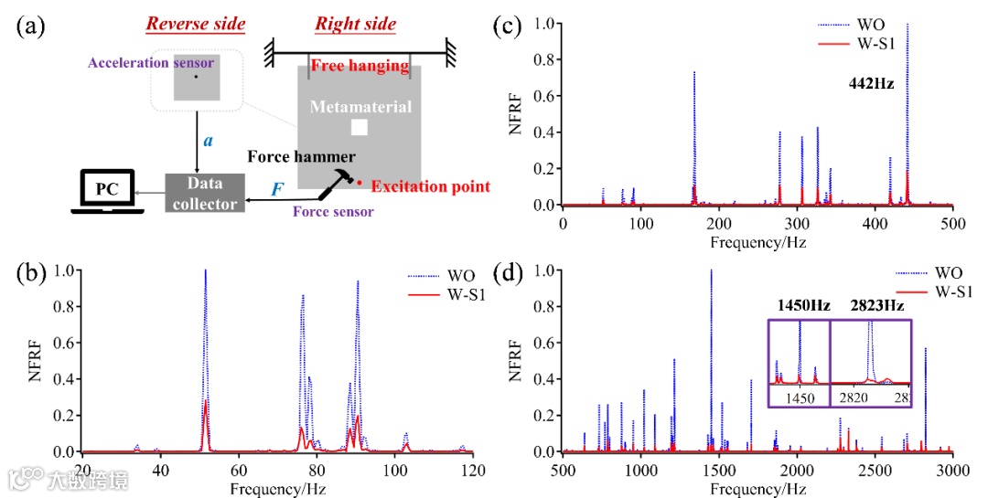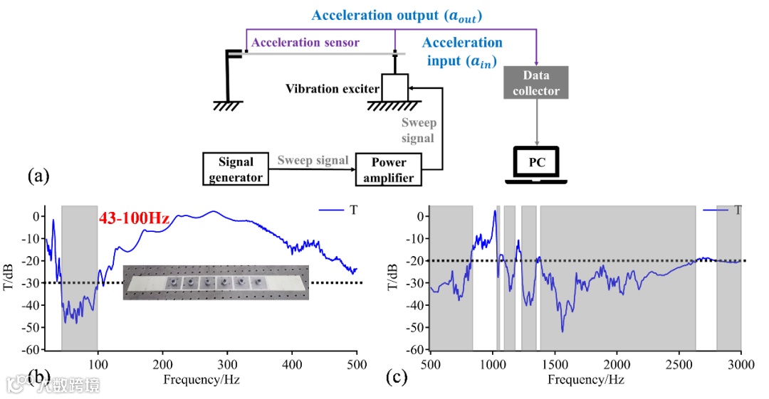 作者进一步对设计的多尺度超结构开展了传输试验测试,验证了实际带隙区间和减振区间。试验结果如图6所示,可以看到,在43∼100 Hz的频率范围内存在一个传输谷,这是由于超结构的带隙作用引起的;而在500~3000Hz范围内,由于颗粒阻尼的强损耗作用,反映出了良好的振动区间覆盖能力(灰色阴影),更直观地展示了谐振器-颗粒阻尼对低-中-高频宽带减振的影响,实现了协同耦合宽带减振性能。